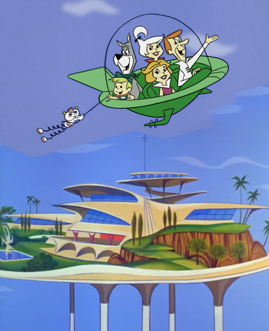 An example of retrofuturism could be architectural styles Googie, Raygun Gothic and Streamline Moderne [9]. These styles were futuristic in their time. Googie architecture often involves light-feeling glass construction combined with dynamic arched curves and star shapes. This style was later caricaturized in The Jetsons. The style originated in the 1940’s; a time when new technologies like jet engines, nuclear energy and space travel gave people the feeling they were entering a new era. Googie architecture resonated with this feeling. The same goes for Streamline Moderne, massive glass or light-colored stone buildings with rounded corners. They seem to be built for a society that never existed. William Gibson perfectly describes the alienating relation we can have with this kind of architecture in his short story, The Gernsback Continuum [10]. A photographer is commissioned to photograph Streamline Moderne architecture and gets lured into the schizophrenic nospace of a “tomorrow that never was”, bringing him feverish daydreams of the perfect people that could have inhabited this space.